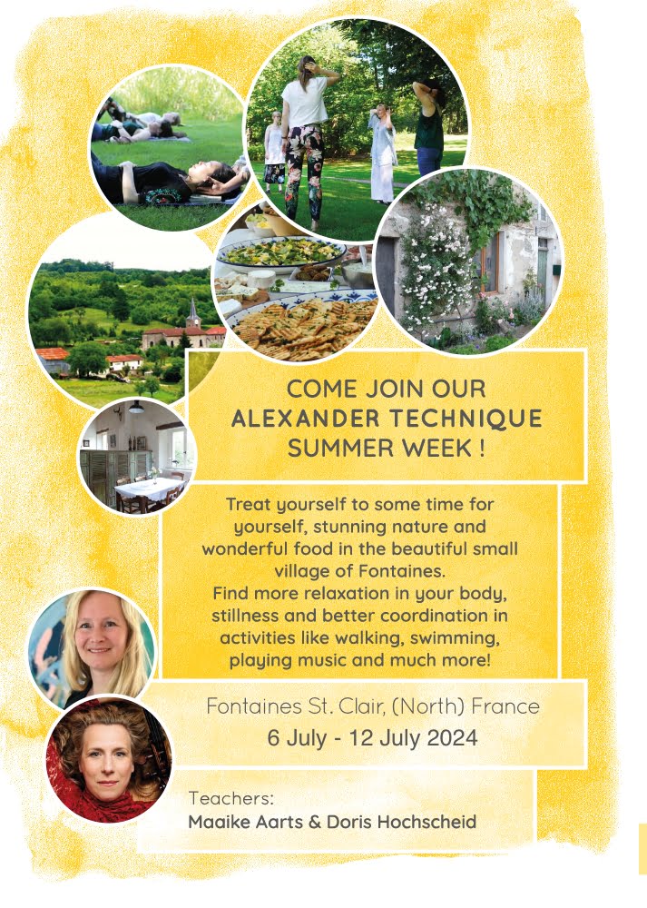 Together with my collegue Maaike Aarts I teach a summer course every your in the north of France, in the wonderful village of Fontaines St. Clair. The setting is relaxed, surrounded by beautiful nature and with delicious food and cosy accommodation. The ideal circumstances to immerse yourself for five days in the Alexander technique and at the same time find total calm and peace.